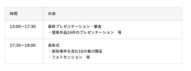 このたび、First Stageを通過した24件の中から、最優秀賞である「都知事杯」、視聴者の投票から選ばれる「オーディエンス賞」など10の賞を決定する「Final Stage」を開催します。