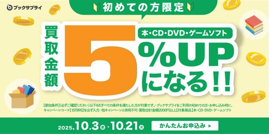 株式会社ブックサプライ(本社:大阪府吹田市、代表取締役:藪田真吾)は、2025年10月3日(金)~10月21日(火)の期間限定で、ブックサプライを初めてご利用になる方を対象とした「買取金額5%UPキャンペーン」を実施いたします。
