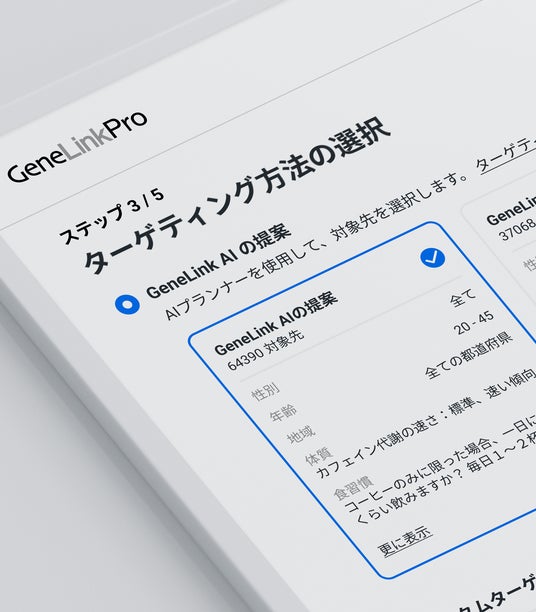 GeneLink(ジーンリンク)は、日本を代表する遺伝子研究・検査及びAI企業であるジェネシスヘルスケア株式会社による、遺伝子情報・ライフスタイル情報・人工知能を融合させ、新時代の「ターゲット・マーケティング」を実現する、革新的な広告プラットフォームです。