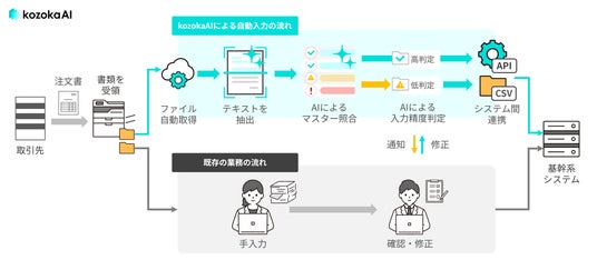 日本国内では依然としてFAXによる受発注が広く利用されており、非効率な手入力作業が業務負荷や人材不足の大きな課題となっています。kozokaAIは、FAXで受領した注文書をAIがOCR処理し、マスターデータとの照合を行い、自動で基幹システムに取り込む仕組みを提供します。