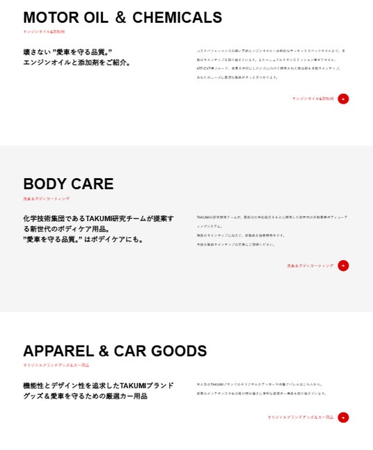 今回のリニューアルは、事業拡大や新製品のラインナップ拡充に伴い、お客様によりわかりやすく情報をお届けすることを目的としています。特に当社のお客様は”愛車を守るための製品”を、インターネットを通じて購入するケースが増えています。そのニーズに応えるために、製品情報の検索性や購入ページへの導線を改善し、初めてTAKUMIブランドを知った方にも安心してご利用いただけるように配慮しました。