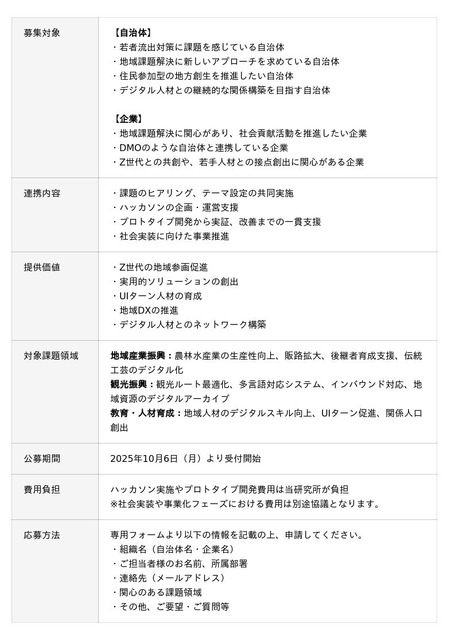 2025年7月実施の「農業AIハッカソン2025」で実証したモデルを全国展開します。Z世代が主導し、プログラミング未経験者でも参加できる生成AI活用型のハッカソンを通じて、地方自治体の課題解決を支援。プロトタイプ開発から社会実装まで一貫して伴走し、自治体の初期費用負担なしで地域課題を解決します。連携自治体・企業の募集を10月6日より開始します。