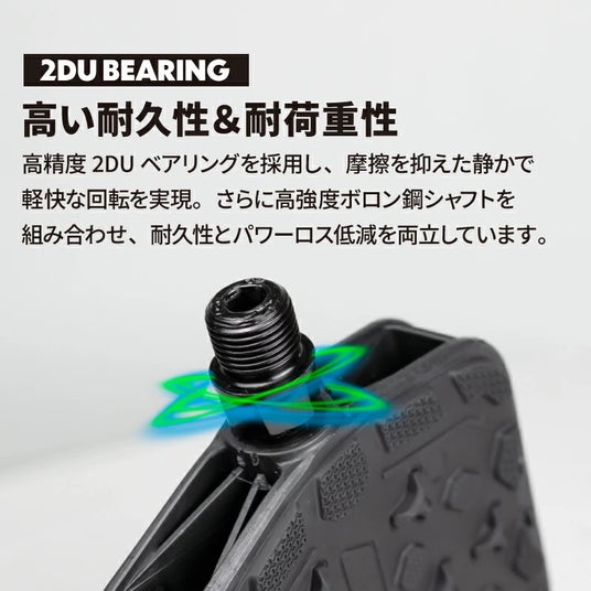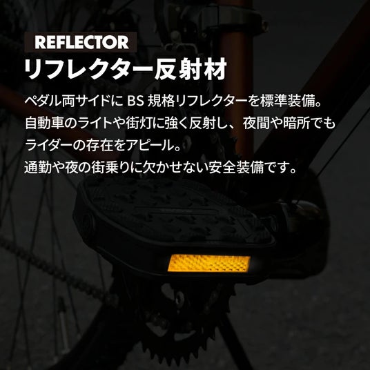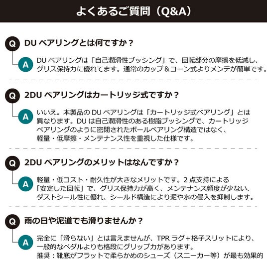 ・本製品は一般的な 9/16インチネジ規格のクランク に適合します。 → 一部のキッズバイク・特殊車両では取付不可。 ・左ペダルは逆ネジ 仕様です。取付時にはご注意ください。 ・取付には ペダルレンチ15mm または 六角レンチ8mmをご使用ください。 ・初期使用時はベアリングのなじみにより回転が固めの場合がありますが、使用とともにスムーズになります。 ・樹脂ボディのため、金属ピン付きペダルに比べて極端なトリックや激しい衝撃下では摩耗しやすいことがあります。