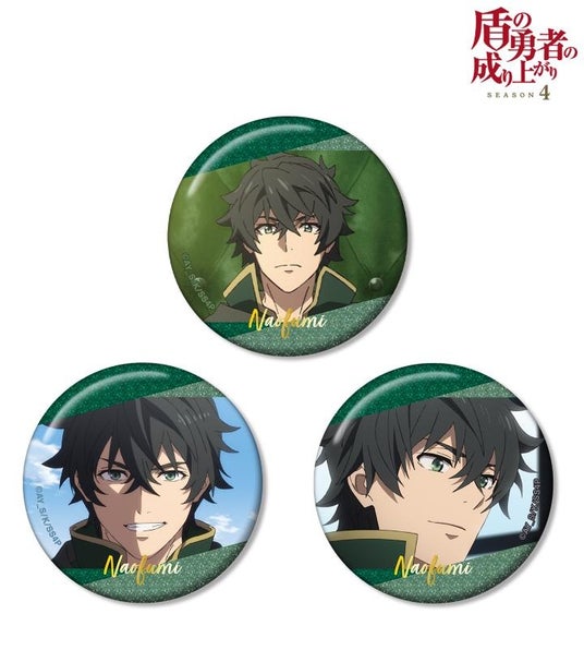岩谷尚文、ラフタリア、フィーロ、サディナ、フォウル、アトラ、ヴァルナール、ジャラリスの印象的なシーンをグリッター加工を施した缶バッジ3個セットに仕上げました。