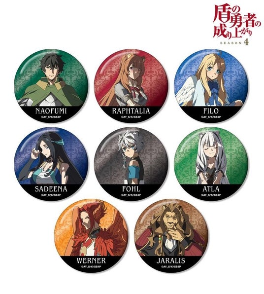 岩谷尚文、ラフタリア、フィーロ、サディナ、フォウル、アトラ、ヴァルナール、ジャラリスのイラストを缶バッジに仕上げました。