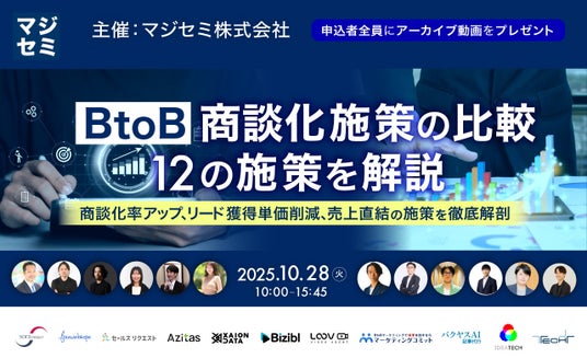 TechSuite株式会社(テックスイート/代表取締役: 畠山夏輝)は、2025年10月28日(火)にマジセミ株式会社が主催するオンラインカンファレンス「BtoB 商談化施策の比較/12の施策を解説~商談化率アップ、リード獲得単価削減、売上直結の施策を徹底解剖~」に登壇します。