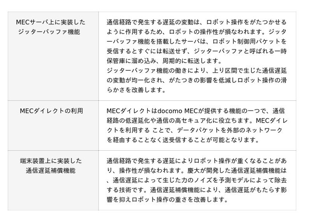 本実証では、モバイルデータ通信の遅延や変動を抑えるためにドコモが開発したジッターバッファ機能と、docomo MECのMECダイレクト(R)機能※5、慶大が開発した通信遅延補償機能の3つの技術を組み合わせ、モバイルデータ通信が遅延する環境であってもリアルハプティクスによる力加減の再現が適切に行えることや、ロボット操作が滑らかに問題なくできることを検証しました。