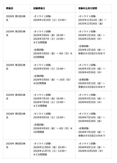 2026年G検定年間開催スケジュールとしては、1月~11月までの期間に計6回の検定を行いますが、そのうち3回は2025年に特別開催した会場試験(オンサイトによる会場での受験)を継続して行います。(オンライン試験:年6回、会場試験:年3回)。また、試験時間および出題数を一部変更します。