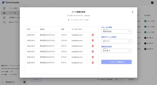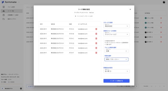 既存のMAツールやエクセルなどで管理している自社の見込み顧客リストをCSV形式でインポートすることで、formmate内で管理できる機能です。1. 「日付、会社名、名前、メールアドレス」の項目に合わせてCSVデータを用意し、アップロードします。