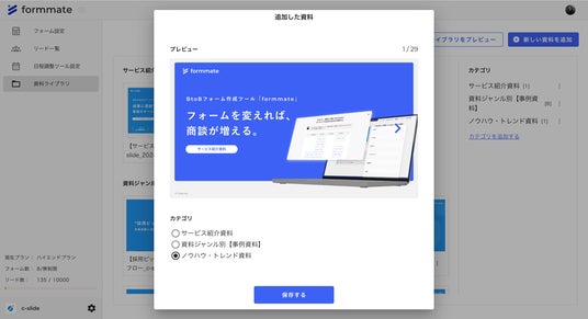 formmateのメール配信機能「1-Clickナーチャリング機能」とは、ライブラリに資料を追加した際に、1-Clickでメール配信ができる機能のことです。配信設定も詳細まで簡単に指定でき、配信後はアクセスを検知します。1. 資料ライブラリに、新しい資料を追加 or 現在の資料を更新・アップロード