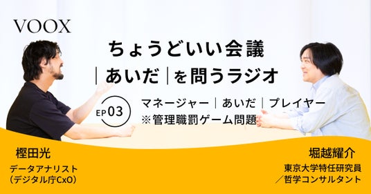 堀越耀介氏(東京大学特任研究員/哲学対話)と樫田光氏(デジタル庁/データ分析)。異なる専門性を持つ二人が世の中の様々な「白か黒か、どちらか一方に割り切れない物事」=“あいだ”について語り合います。何かと何かの“あいだ”を切り口に問いを進めることで予測不能な化学反応を生み出し、聴く人に新たな気づきを与えてくれる。そんな"ちょうどいい"を探求する二人のクロストークをお楽しみください。