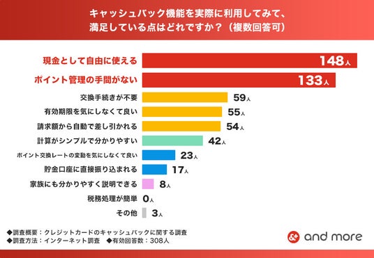 - 満足している点、1位は『現金として自由に使える』(148人)、2位『ポイント管理の手間がない』(133人)