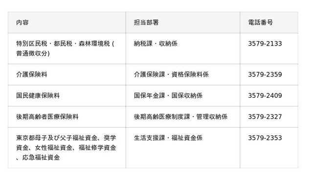 その他、各種注意事項につきましては、事前に区ホームページをご覧いただくか、各支払い担当部署までお問合せください。