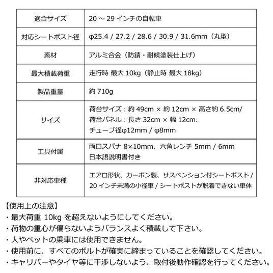 ・最大荷重 10kg を超えないようにしてください。 ・荷物の重心が偏らないようバランスよく積載して下さい。 ・人やペットの乗車には使用できません。 ・使用前に、すべてのボルトが確実に締まっていることを確認してください。 ・キャリパーやタイヤ等に干渉しないよう、取付後動作確認を行ってください。