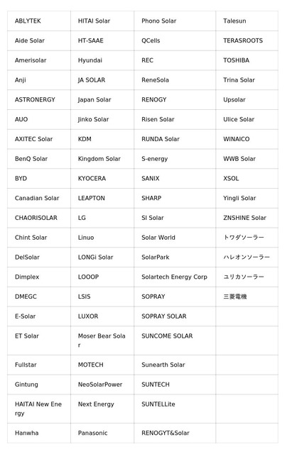 現在、掲載パネルは300種類、80社(アルファベット順)のメーカーに対応しています。