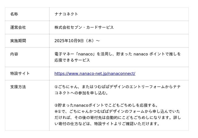 ナナコネクトサービスを利用される皆さまが、私たちの活動を気軽に応援してくださる機会が広がったことを、大変ありがたく感じております。「こどもごちめし」は、子どもたちが地域の飲食店で安心してお食事を召し上がれる環境を広げていく取り組みです。子どもたちが健やかに成長するためには、栄養ある食事はもちろん、安心して居場所を持てる社会の仕組みが欠かせません。皆さまが日常的に利用するnanacoを通じての支援は、新しい社会貢献の新しい形だと確信しております。この仕組みがより多くの方に広がり、子どもたちの未来を共に支えていけることを心から願っています!