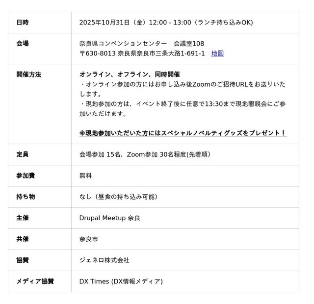 【Drupal Meetup 奈良】は 企業のDXを推進するオープンソースCMS Drupalに興味を持つ方々が集まるコミュニティです。コミュニティの特徴として、Drupalの枠にとらわれず、DXの観点からのキャリア形成や情報交換を目指しています。