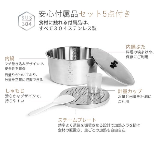 ■安心・安全の素材安心して長くお使いいただくために、電鍋の内部素材には、食品グレードのSUS304ステンレスを採用しています。錆びにくく、耐久性に優れているため、お手入れも簡単です。毎日使うものだからこそ、安全性と清潔さにも徹底的にこだわりました。