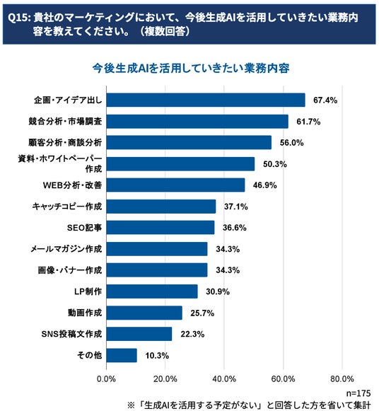 情報通信業やサービス業では、多くの企業がAIを日常的に活用していることが判明しました。特に、情報通信業では「毎日活用」している企業の割合が、他の業種を大きく上回っており、製造業の2倍以上という結果が出ています。先行企業は、コンテンツ作成といった実行フェーズだけでなく、今後AIを活用したい業務として、「企画・アイデア出し」(67.4%) や 「競合分析・市場調査」(61.7%) が上位を占めています。これは、多くの企業がAIを単なる作業ツールから、より創造的・戦略的なパートナーとして捉え始めていることを示唆しています。