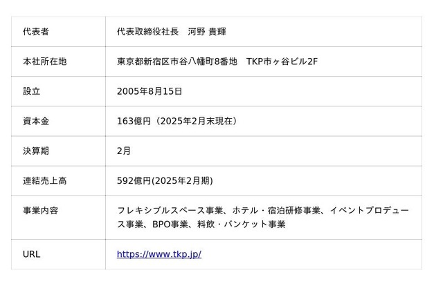 株式会社ティーケーピー(本社:東京都新宿区、代表取締役社長:河野 貴輝、以下TKP)は、2024年4月に取得した「TKP大分ビル(旧JTB大分ビル)」をリニューアルし、新たに貸会議室とシェアオフィスが融合した「TKP fabbit大分駅前」として、2025年10月20日(月)にオープンいたします。