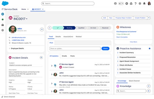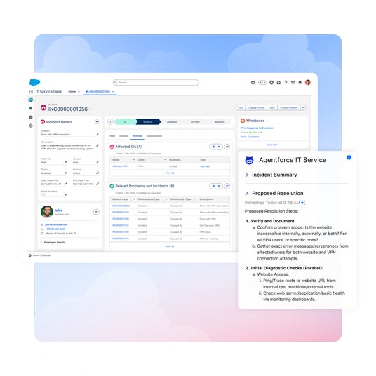 IT Service Deskは、Agentforce、生産性向上ツール、そしてナレッジによって強化されたインテリジェントなワークスペースです。課題の要約・検知・解決を自動化し、IT部門の生産性を高めるとともに、対応時間を大幅に短縮します。また、インシデント管理・問題管理・変更管理といったエンドツーエンドのITILプロセスを単一のプラットフォーム上で自動化します。