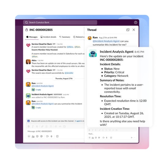 Agentforceは、インシデントの作成・要約・解決を自動で行い、ITチームの生産性を大幅に向上させます。これにより、従来の「受け身のサポート」から脱却し、Slack上で直接提供される会話型の能動的サポートへと進化します。