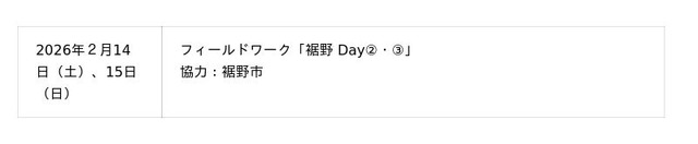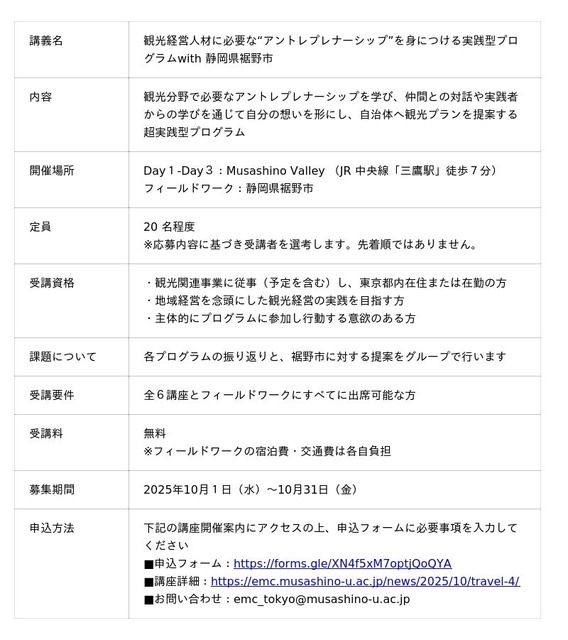 初年度となる2025年度は、観光に関する事例を学びつつ、自身のうちに秘めたアントレプレナーシップを呼び起こすプログラムを実施するほか、静岡県裾野市の協力のもと、同市に対して観光に関する提案を行います。講義は2025年11月15日(土)、11月29日(土)、12月6日(土) の午後に都内で実施し、2026年2月14日(土) 、15日(日)には静岡県裾野市にてフィールドワークを行います。