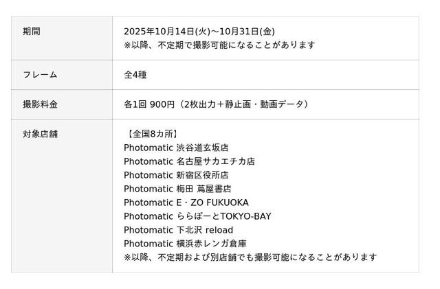 キタムラ・ホールディングス グループのピックハイブ株式会社(本社:東京都新宿区、代表取締役社長兼COO:大迫 由典)の運営するセルフフォトブランド「Photomatic」は、2025年10月14日(火)から10月31日(金)の期間中、2026年に40周年を迎える『ぼのぼの』とのコラボレーションを実施いたします。ぼのぼのたちがハロウィンの仮装をした限定フレームやしまっちゃうおじさんがテーマのファン心をくすぐるフレームなど、遊び心のある全4種のオリジナルフレームを渋谷・新宿・大阪をはじめとした全国8カ所のPhotomaticで提供します。