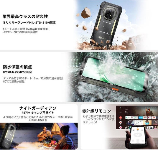 さらに、IP68/IP69K・MIL-STD-810H準拠の高耐久設計と、最新のAIカメラシステムを備え、過酷な環境下でも妥協なく使用できるよう設計されたタフネススマートフォンです。