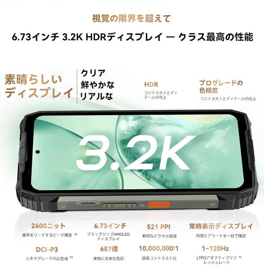 6.73インチの3.2K HDR AMOLEDディスプレイは、ピーク輝度2,600nits/521ppi/68.7億色表示というフラッグシップ級の映像美を提供。