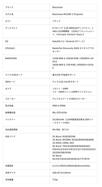 Blackview XPLORE 2 Projectorの詳細スペック・仕様