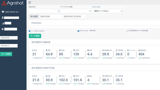 アグリショット株式会社(本社:和歌山県和歌山市、代表取締役:硲田孝之、共同代表:西岡一洋)は、2025年10月6日、薄膜回路形成技術を用いた非破壊式の「薄膜型樹液流センサ」と、樹液流データの可視化・解析を行うクラウドサービス「Sapflow Monitor(サップフロー・モニター)」を正式にリリースしました。