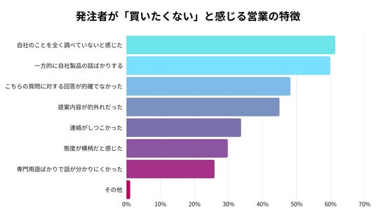 3. 発注者は「自分ごと化」された提案を熱望: 発注担当者が「買いたい」営業は「自社や業界への深い理解(68.3%)」を持つ担当者。逆に「買いたくない」のは「自社のことを全く調べていない(61.4%)」担当者。