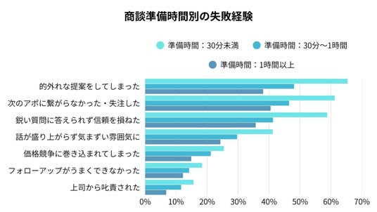 準備時間が短いほど、あらゆる失敗を経験する割合が高くなることがわかります。特に準備時間「30分未満」の層は、65.4%が「的外れな提案」、61.2%が「失注」、58.8%が「信頼毀損」という致命的な失敗を経験しています。準備不足が多岐にわたる機会損失に直結していることが鮮明になりました。