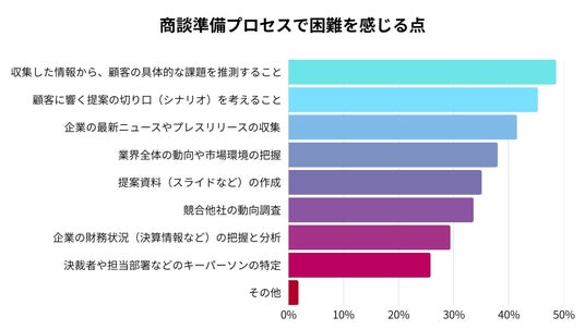 準備プロセスで特に困難を感じる点を尋ねると、「顧客の具体的な課題を推測すること(48.6%)」「顧客に響く提案の切り口(シナリオ)を考えること(45.3%)」という、深い思考を要する工程が上位を占めました。情報収集だけでなく、そこから価値ある提案を創出するプロセスに大きな負荷がかかっていることがわかります。