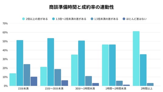 商談準備時間と「準備の有無による成約率の差」の実感を詳細にクロス集計したところ、準備時間が長くなるほど、成約率への好影響を強く実感する傾向が明確に見て取れました。特に準備に「2時間以上」をかける層では61.3%が「2倍以上の差がある」と回答しており、これは準備時間「15分未満」の層の4.3倍以上の数値です。