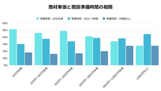 取り扱い商材の単価別に商談準備時間を見ても、単価が上がるほど準備時間も増えるという単純な相関は見られません。「1,000万円以上」の高額商材を扱う層でさえ、27.8%が準備時間「30分未満」と回答しており、時間不足が単価に関わらず営業組織全体の根深い課題であることを示唆しています。