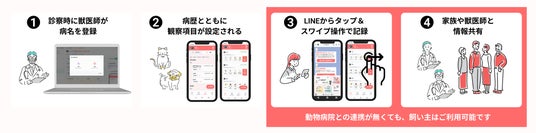 本サービスのLINE公式アカウントを友達追加することで、飼い主が家族でペットの病状を簡単に記録・共有できます。本サービスを導入する動物病院を受診すると、通院履歴と病歴を自動蓄積し、現疾患に応じた記録項目が自動設定されます。そして、飼い主は診察内容の備忘録を作成します。記録した内容は飼い主が登録した動物病院全てにリアルタイムで共有されます。動物病院は、ノコロクを導入することによって、患者の病歴や病状記録を把握して治療に活用できる他、飼い主から診察内容のフィードバックを得られるようになります。