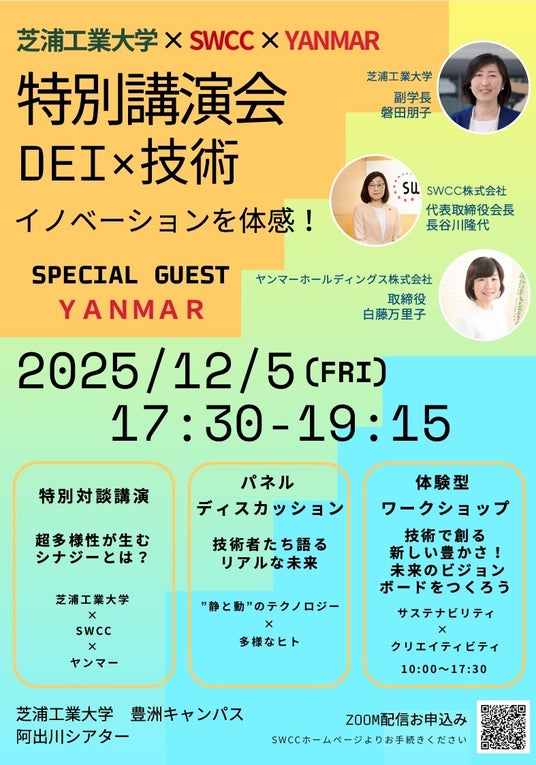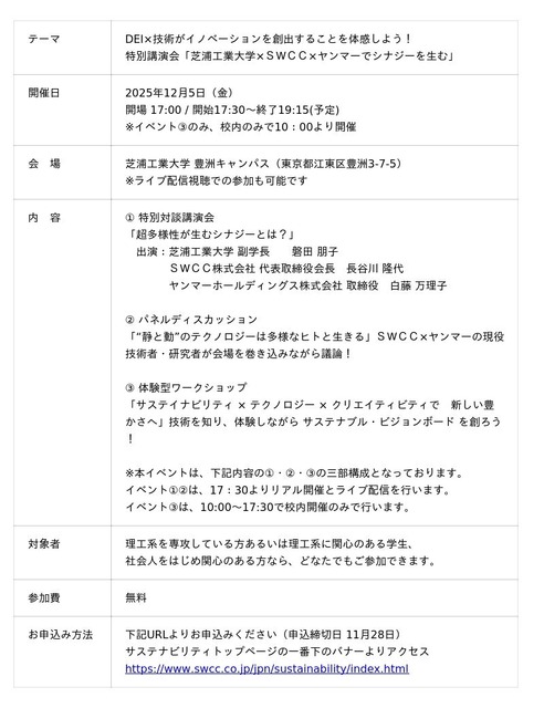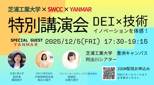 SWCC株式会社と芝浦工業大学は、多様性が尊重される社会の実現を促すことを目的に、ダイバーシティ・エクイティ・インクルージョン(DEI)を共に推進すべく、2023年12月13日に包括連携協定を締結しており、本講演会はその取り組みの一環として、SWCC株式会社と芝浦工業大学の共催、ゲストにヤンマーホールディングス株式会社をお招きして行われます。