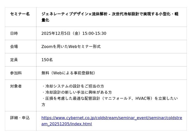サイバネットシステム株式会社(本社:東京都、代表取締役 社長執行役員:白石 善治、以下「サイバネット」)は、Diabatix nv(本社:ベルギー王国ルーベン市、以下「Diabatix社」)と日本国内で初めて販売代理店契約を締結し、Diabatix社が開発するトポロジー最適化(※1)を応用した熱流体ジェネレーティブデザイン(※2)プラットフォーム「ColdStream(コールドストリーム)」の販売および技術サポートを、2025年10月から開始することをお知らせいたします。