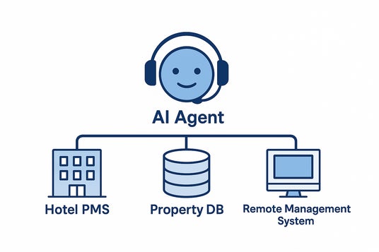 ・当社クラウドのAPIハブ機能が、PMSとAIエージェントをつなぐ“通訳”として機能。さらにグループ会社の株式会社デバイスエージェンシーが販売する「AdvaNceD IoT客室内線電話」との連携で、客室からの問い合わせも自動化。