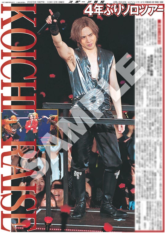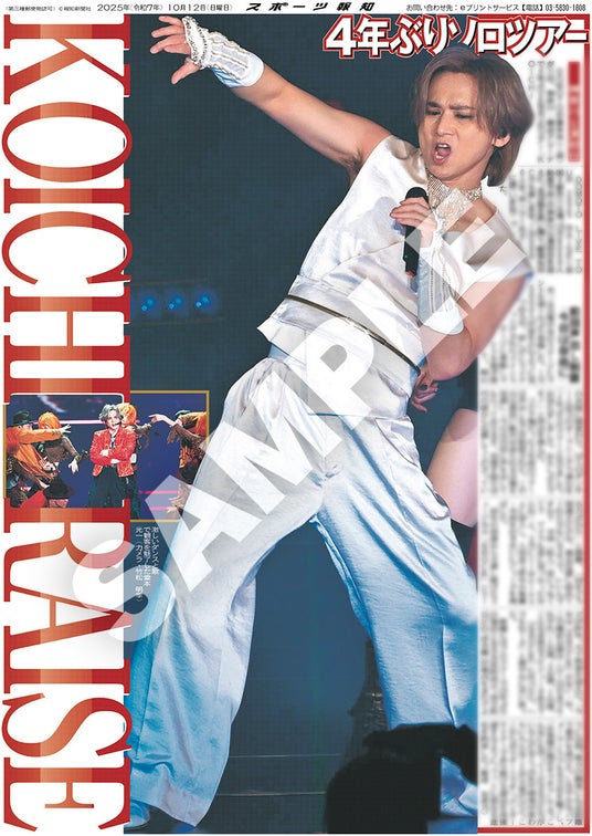 スポーツ報知を発行する報知新聞社(代表取締役社長・長谷川剛)は新聞の一部紙面をコンビニエンスストアのマルチコピー機からプリントできる「スポーツ報知コンビニプリント」サービスを展開中。スポーツ紙ならではの大きな写真を使った紙面をプリント版として販売しています。10月12日付掲載、DOMOTOの堂本光一のソロツアー「KOICHI DOMOTO LIVE TOUR 2025 RAISE」の神奈川公演初日の模様を伝える紙面を発売。3種類の発売になります。