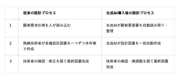 従来は熟練技術者が2~3週間かけて手作業で作っていた設計図書を、AIがわずか数時間~数日で最終修正・確認作業で完成するレベルまで自動作成します。これは手書きをタイピングに変えるような劇的な変化で、設計期間の短縮が期待されます。
