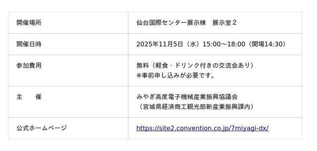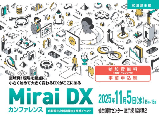 宮城県では、2025年11月5日(水)宮城県中小製造業DX推進イベント『Mirai DX カンファレンス』を仙台国際センターで開催いたします。