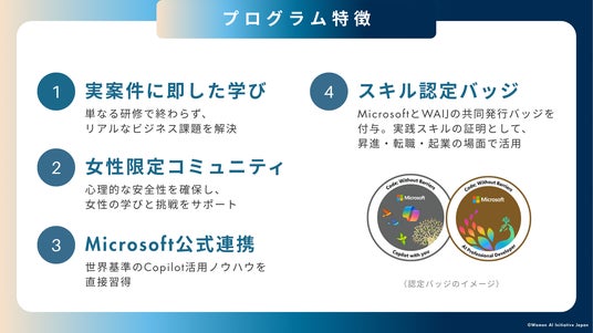 一般社団法人Women AI Initiative Japan(所在地:東京都渋谷区、代表理事:國本 知里、以下:WAIJ)は、日本マイクロソフト株式会社(所在地:東京都港区、以下:日本マイクロソフト)が提供する女性向けAI人材育成支援プログラム「Code; Without Barriers in Japan」との連携を開始し、女性のための実践型リスキリングプログラム『Copilot Women AI実践リスキリングプログラム』の申し込みを2025年10月15日(水)より受付開始いたします。初回(Batch1)の募集では、通常は1.5万円(実費相当)の参加費が必要となるところ、全てのプログラムを無償で提供いたします。