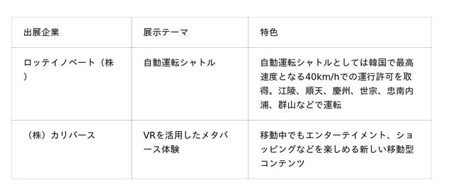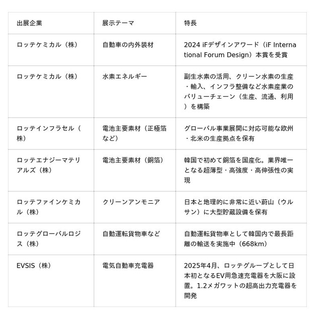 今回は、ロッテケミカル株式会社、ロッテインフラセル株式会社、ロッテエナジーマテリアルズ株式会社、ロッテファインケミカル株式会社、ロッテイノベート株式会社、ロッテグローバルロジス株式会社、EVSIS(イーブイシス)株式会社、株式会社カリバースなど、ロッテグループの未来モビリティ事業をリードする主要系列社が共同参加いたします。出展ブースは「モビリティ技術ゾーン」と「モビリティ体験ゾーン」という2つのゾーンで構成する予定です。