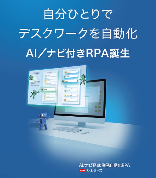 デスクワークを自動化!AI/ナビ搭載 業務自動化RPA RKシリーズナビに沿ってクリックするだけで新規シナリオ作成ができる『フローナビゲーション』機能を搭載。ExcelやWord、フォルダ、任意のアプリなどのデータを取り出したい項目を選び、操作手順を決め、あとはナビに沿ってクリックするだけで設定が完了。わずか2ステップでシナリオ作成ができるので、感覚的に自動化プログラムが組め、とても簡単です。さらに業界初のAI機能を搭載しています。