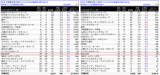 5億米ドル以下の公表案件ベース18位、0.5億米ドル以下の公表案件ベース18位にランクインしました。