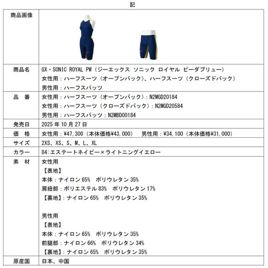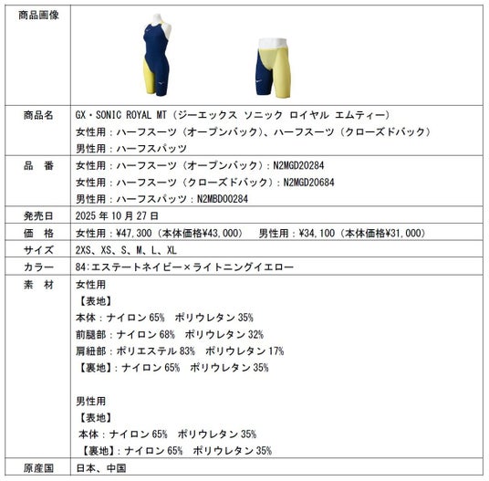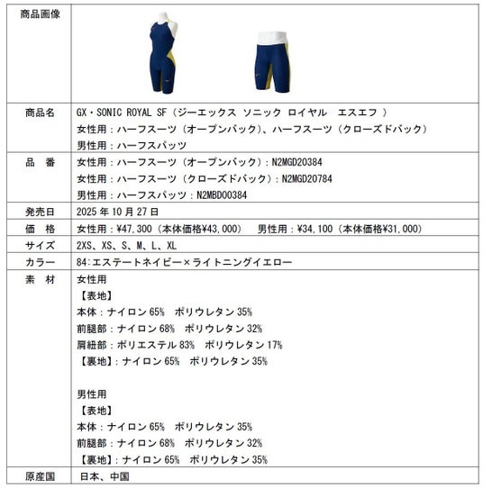 ミズノは、布帛製トップスイマー向けの競泳用水着「GX・SONIC ROYAL(ジーエックスソニックロイヤル)」を10月27日にミズノ直営店(MIZUNO TOKYOとミズノオオサカ茶屋町)で先行発売します。ミズノ公式オンラインでは12月10日より、一部のミズノ品取扱店では1月20日より順次発売します。
