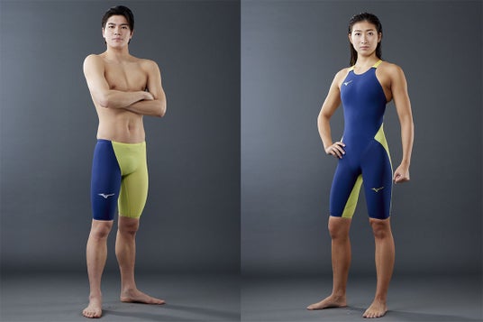 「GX・SONIC ROYAL」を着用する松下知之選手(東洋大学/スウィン宇都宮)と池江璃花子選手(横浜ゴム)
